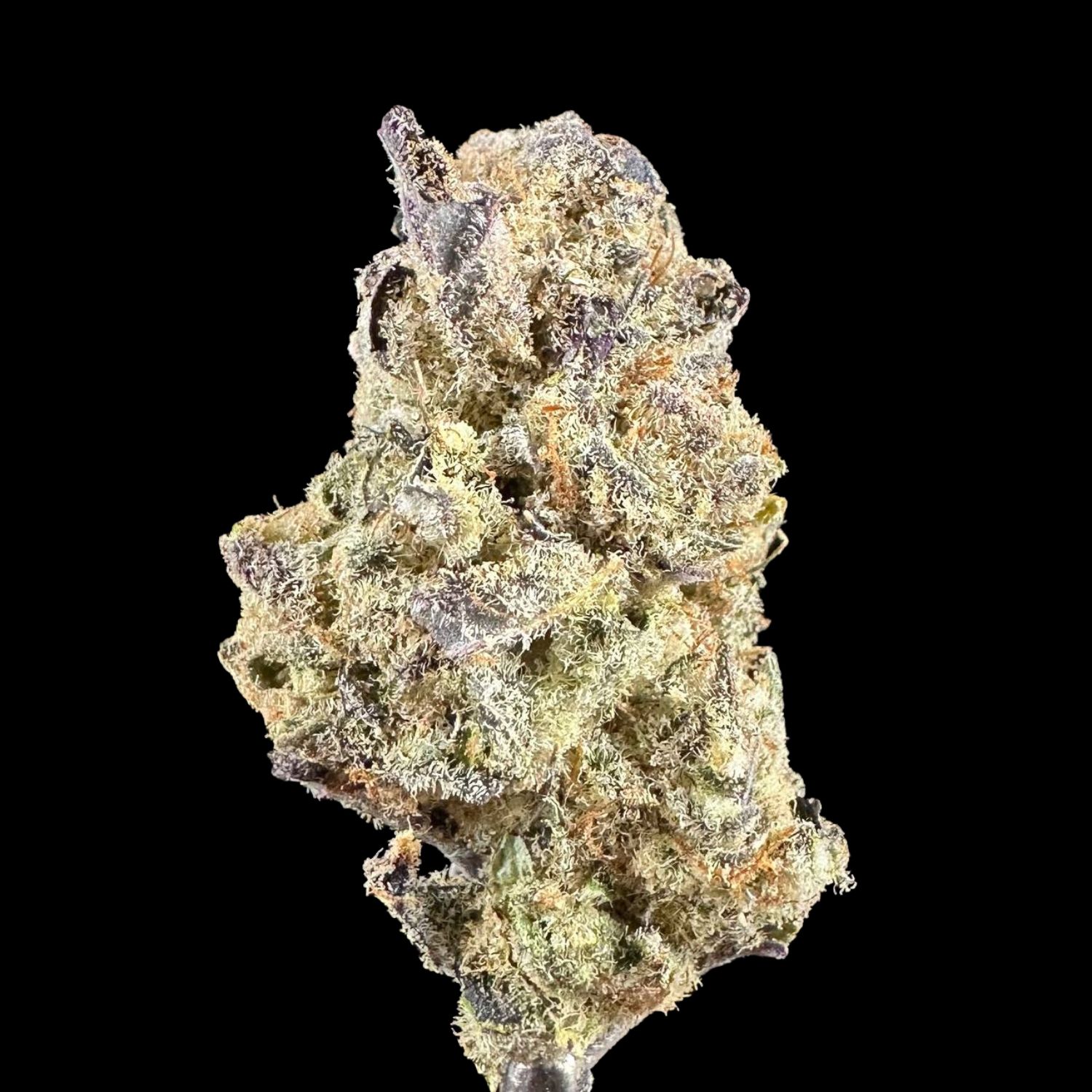 Rich forest green dominates the color palette, accented by deep purple hues inherited from its Granddaddy Purple lineage. Bright orange pistils weave throughout the buds like copper threads, creating a striking visual contrast that catches the eye immediately.