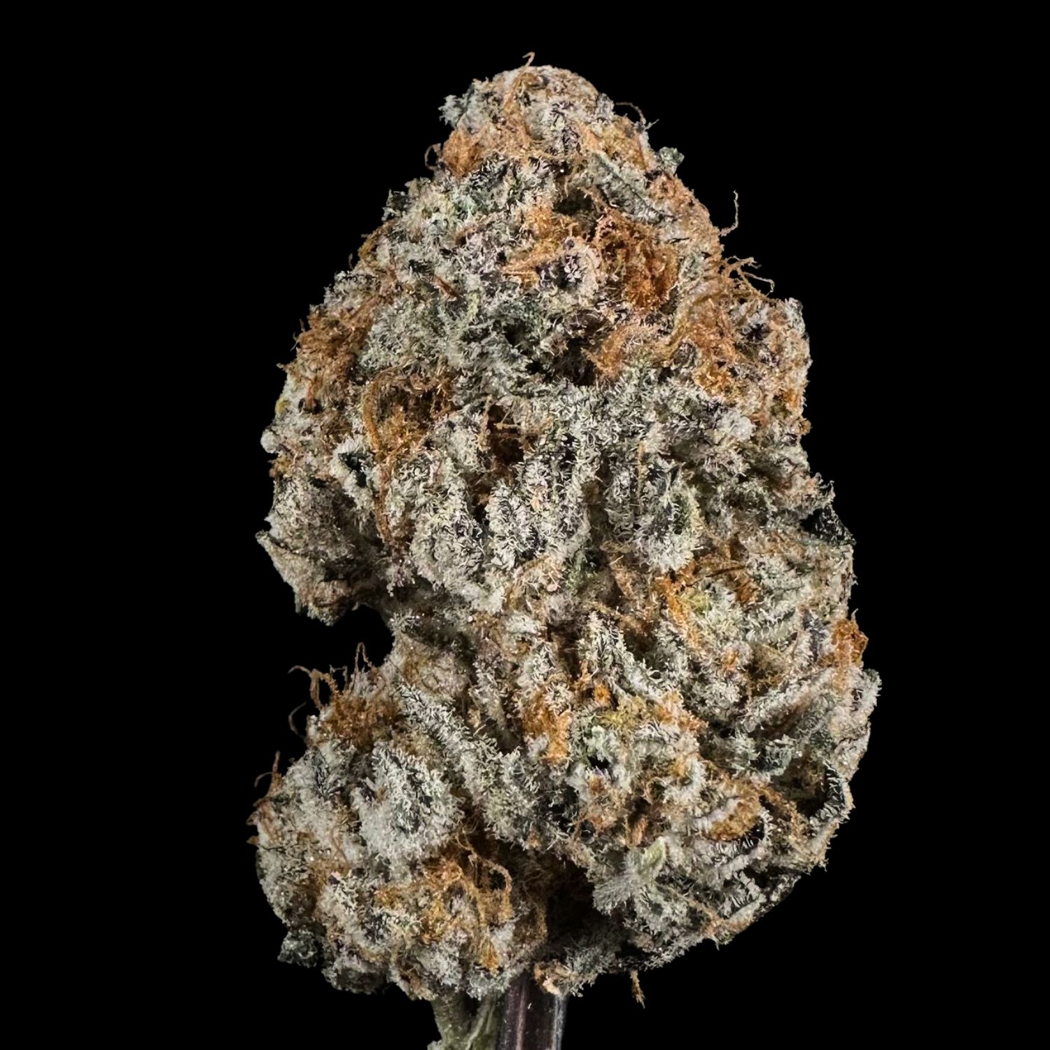 This indoor organic masterpiece showcases dense, resin-packed buds with a complex aroma profile that blends sweet undertones with gassy diesel notes, spicy accents, and nutty depth. The skunky diesel finish reveals exceptional trichome coverage that sparkles like fresh snow, indicating premium cultivation and careful curing that preserves every aromatic compound.